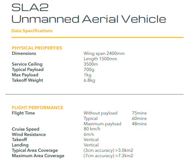 Duży zasięg, pionowy start/lądowanie oraz kamera Sony RX1RMII na pokładzie gwarantują wysoką wydajność pozyskiwania danych fotogrametrycznych oraz ich wysoką jakość. SLA-2 z uwagi na swoją konstrukcję oraz możliwości jest rozwiązaniem uniwersalnym, które może służyć do wykonywania misji w zasięgu wzroku VLOS jak również BVLOS (loty poza zasięgiem wzroku operatora).